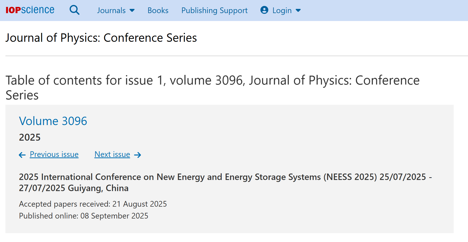 第二届新能源与储能系统国际学术会议(NEESS 2026)将于2026年11月6日至8日在中国贵阳举行。主要围绕“能源科学”、“动力与电气工程”、“信息系统”等研究领域展开讨论。本届大会希望能促进国际间的学术交流与合作,为新能源与储能系统的专家学者提供一个展示研究成果,探讨学科最新进展和未来趋势的平台。我们诚挚邀请全球的研究人员、工程师及学术界同仁,共襄盛会,共同推动新能源与储能系统的发展,以应对新的科技挑战并服务于社会需求。