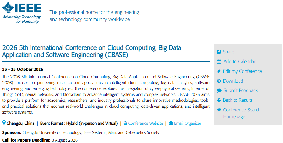 第五届云计算、大数据应用与软件工程国际学术会议(CBASE 2026) 2026 5th International Conference on Cloud Computing, Big Data Application and Software Engineering 2026年10月23-25日丨中国-成都(线上线下同步) | |
