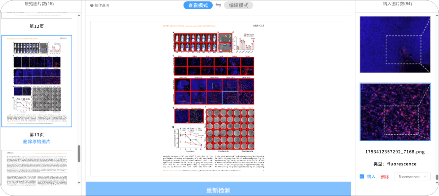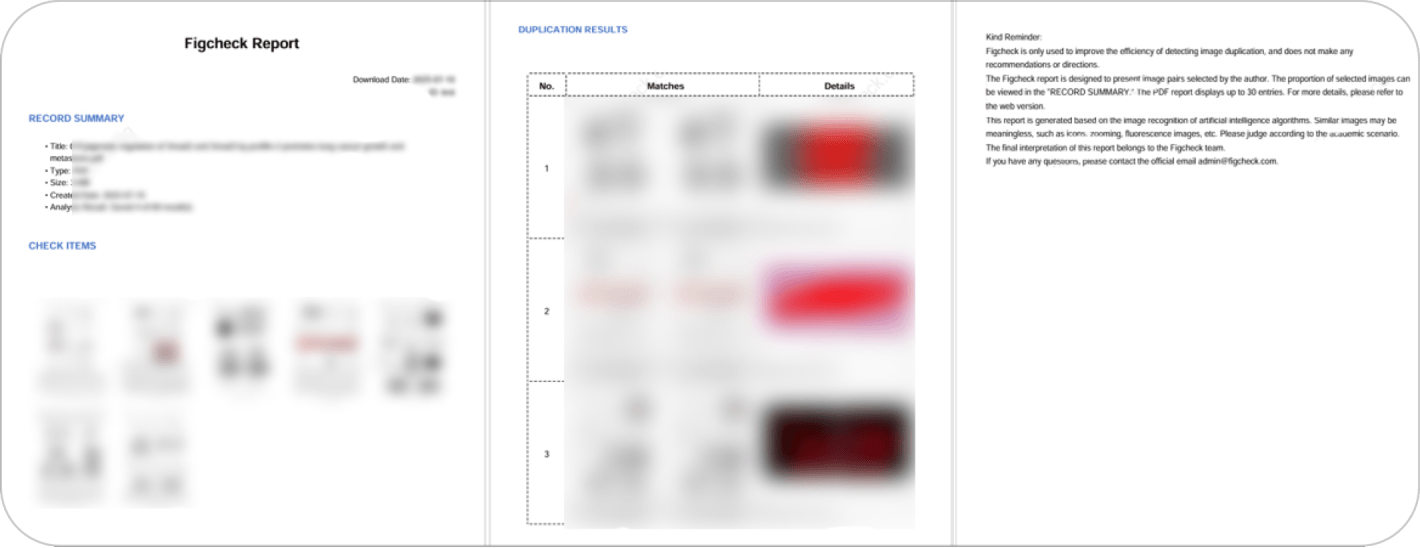 PDF检测报告勾选图片对,则该图片对被纳入报告中。报告包含账号、时间、文件概要、检测图片预览。支持最多30个重复图片(满足单篇图片重复数量),请以线上结果为准。