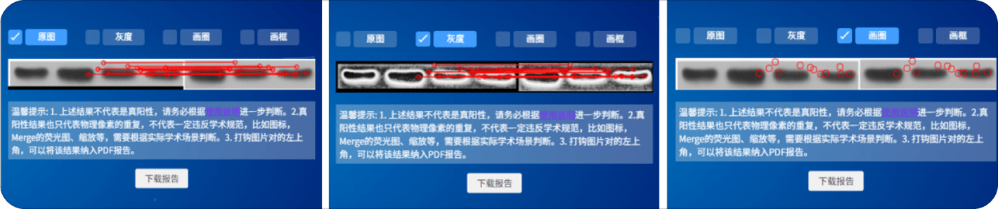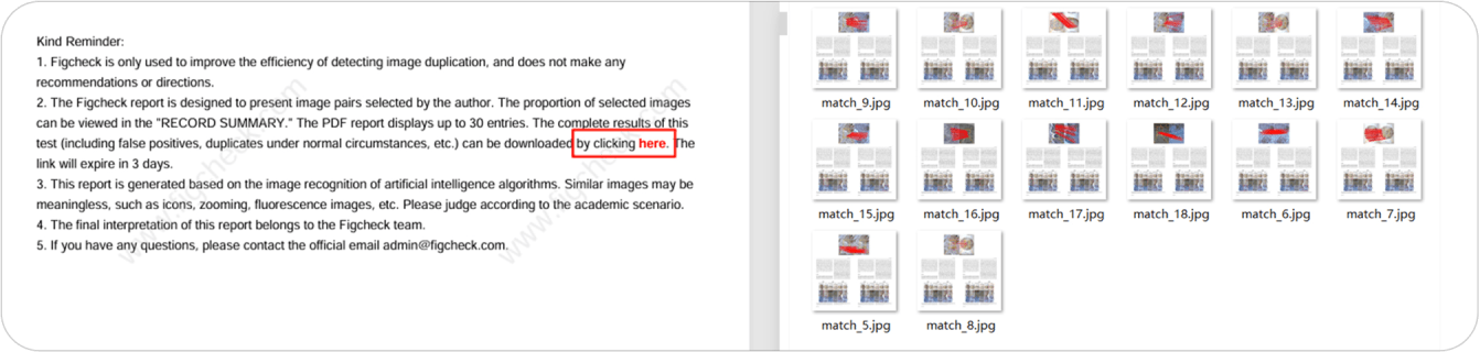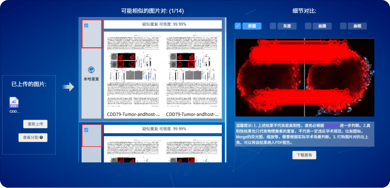 需要注意的是,Figcheck仅用于提高图像重复检测的效率,不代表任何指向性。Figcheck报告用于长久保存真阳性检测结果,PDF报告最多选择30个图片对。如果需要本次检测的所有14个结果,可以点击底部的"