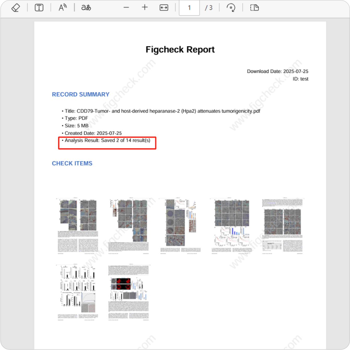 Figcheck报告首先展示了本次检测的概要,包括时间,账号,文件格式,大小,文件题目。还包括结果总数和纳入本报告的数量。CHECK ITEMS展示了本次检测的图片缩略图。